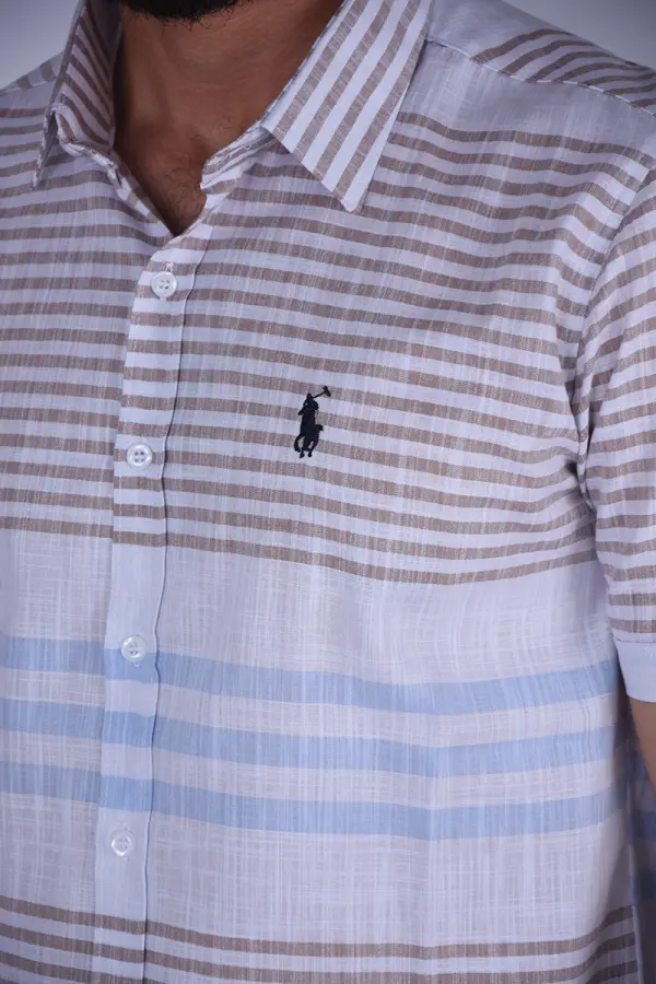 chemise Ralph lauren en Pur Lin Rayé demi manche Ref-RY0161X (Beige & Bleu )